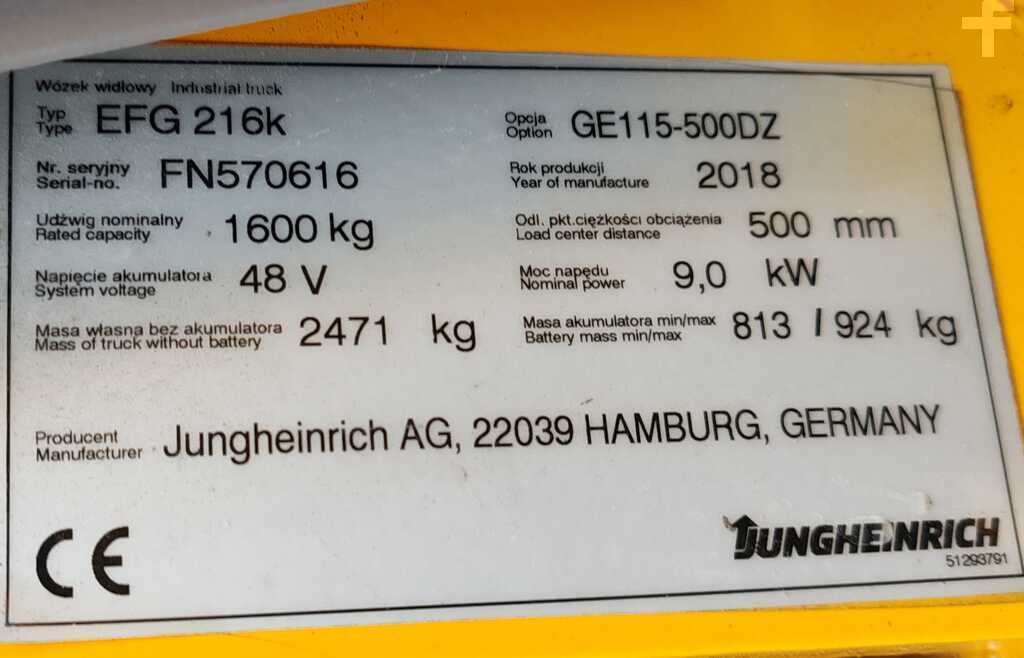 Стан агрегату – б/в, напрацювання 7589 м/г, габаритна висота 2230 мм. Вибираючи Jungheinrich EFG216k, ви отримуєте надійну і високопродуктивну техніку для будь-яких складських завдань.