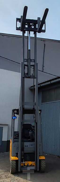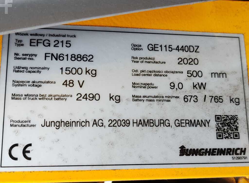 Jungheinrich EFG215 2020 року – сучасний електричний вилочний навантажувач для складів, виробничих цехів і логістичних центрів. Цей електричний вилочний погрузчик має вантажопідйомність 1500 кг, триплексну щоглу з висотою підйому 4400 мм, довжину вилки 1150 мм та габаритну висоту 2010 мм, що забезпечує комфортну та ефективну роботу на складі.